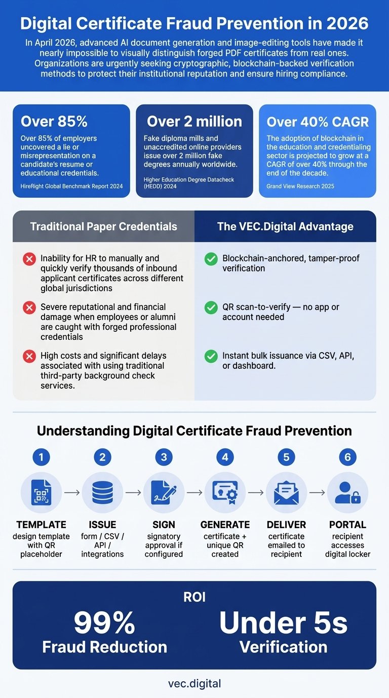 Over 85% of employers uncovered a lie or misrepresentation on a candidate's resume or educational credentials in 2024, according to the HireRight Global Benchmark Report. As sophisticated AI editing tools make forged documents virtually indistinguishable from authentic ones, digital certificate fraud prevention has become a critical mandate for global organizations. The continued reliance on easily manipulated legacy PDFs is exposing institutions to severe reputational damage, compliance violations, and costly hiring mistakes.