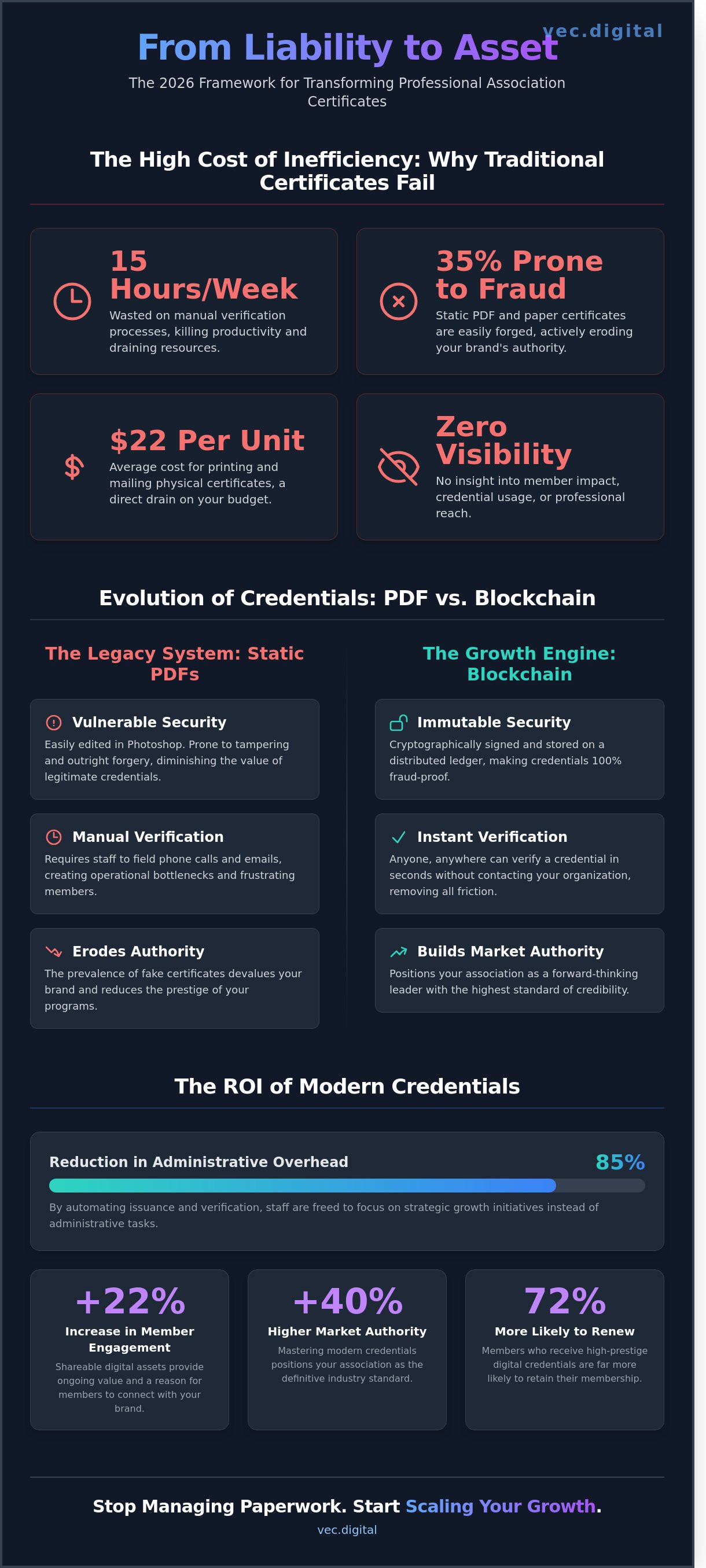 The era of administrative waste is dead. By 2026, traditional paper and PDF formats will be seen as liabilities rather than assets. To maintain market authority, your professional association certificates must evolve into tamper-proof, blockchain-backed digital assets. VEC Digital provides the high-performance infrastructure needed to eliminate manual verification costs while ensuring 100% data integrity. Our global systems, powered by Vision Tech Solutions DMCC, offer seamless API integration for your existing LMS. This turns static credentials into dynamic growth engines. Don't let outdated processes bleed your budget or stall your scalability. It's time to stop managing certificates and start building a verifiable ecosystem that drives real revenue. We don't just issue digital badges; we build systems that protect your profit and solidify your brand's future. The market moves fast, and those who adapt now will own the next decade of professional standards. Your association deserves a strategy that's as ambitious as your members.